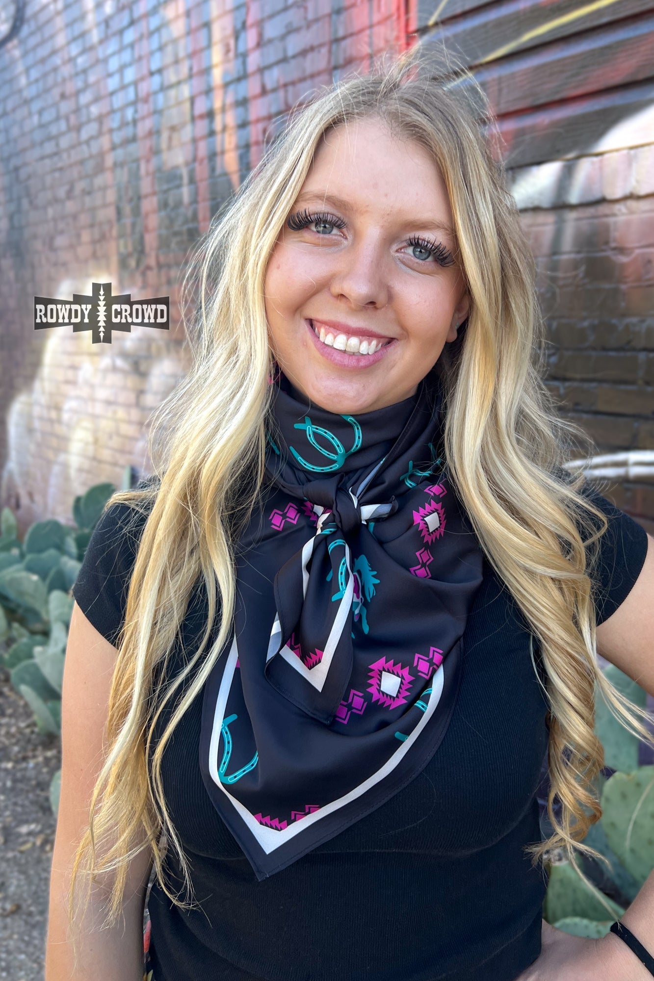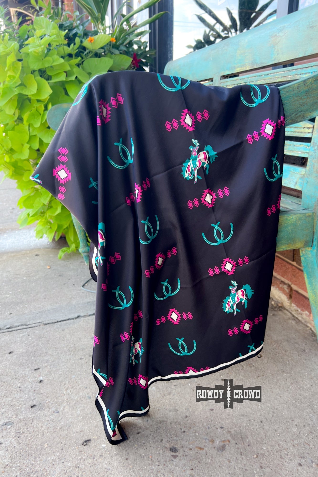 Add a playful touch to your western wardrobe with our Bunk House Wild Rag/Scarf! Featuring a bronc rider design in fun colors of black, teal, and pink, this scarf is the perfect accessory for any quirky cowgirl or cowboy. Giddy up and grab yours today!