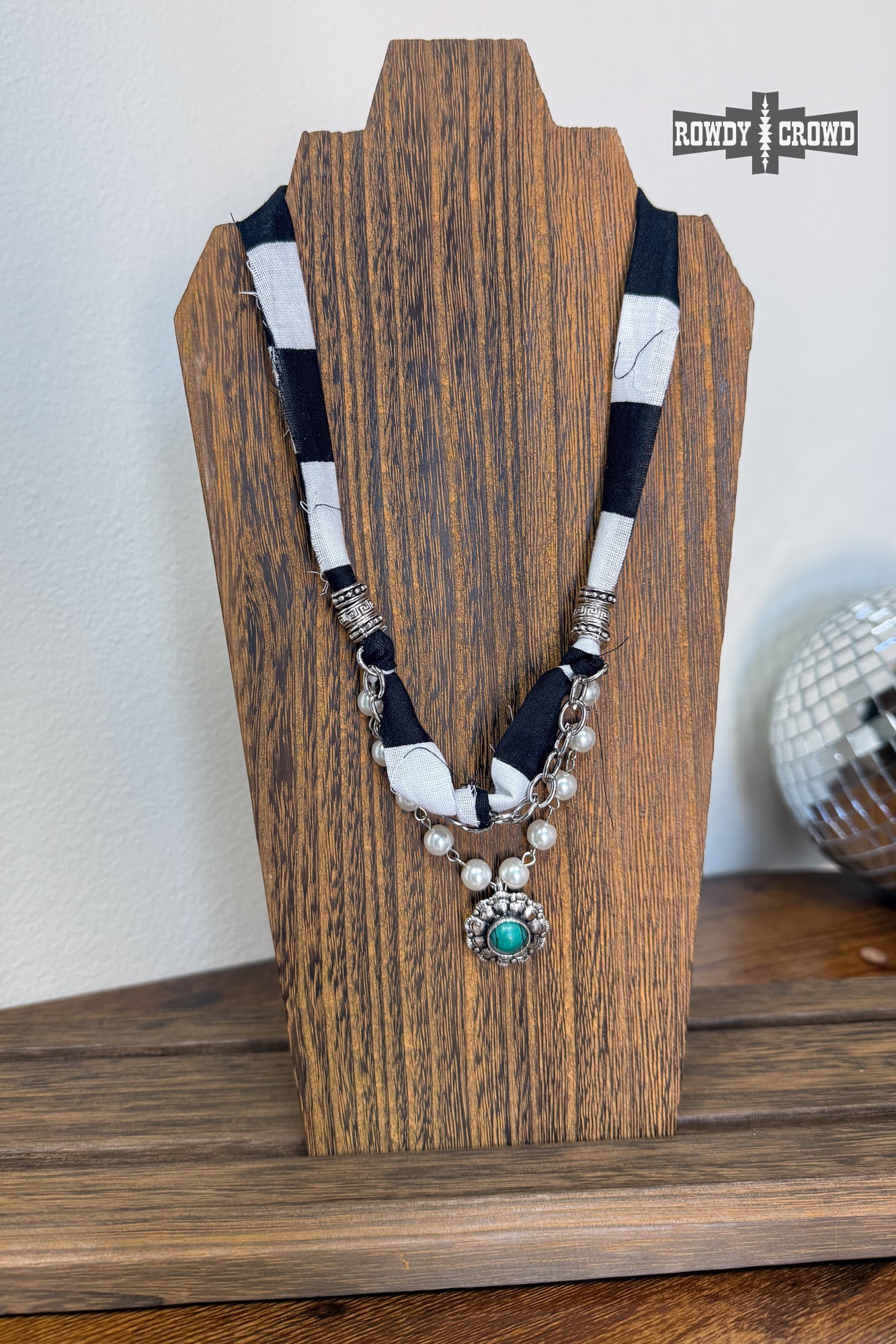 Get ready to start your engines and ride in style with our Checker Concho Necklace. A black and white checkered strand with silver beads and a matching chain twisted around the center, a pearl strand giving a layered look with a concho pendent giving the perfect touch of turquoise.