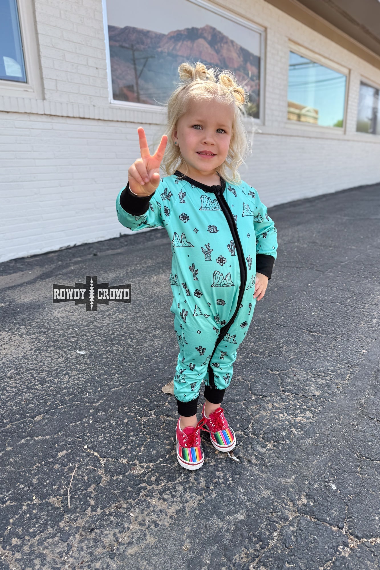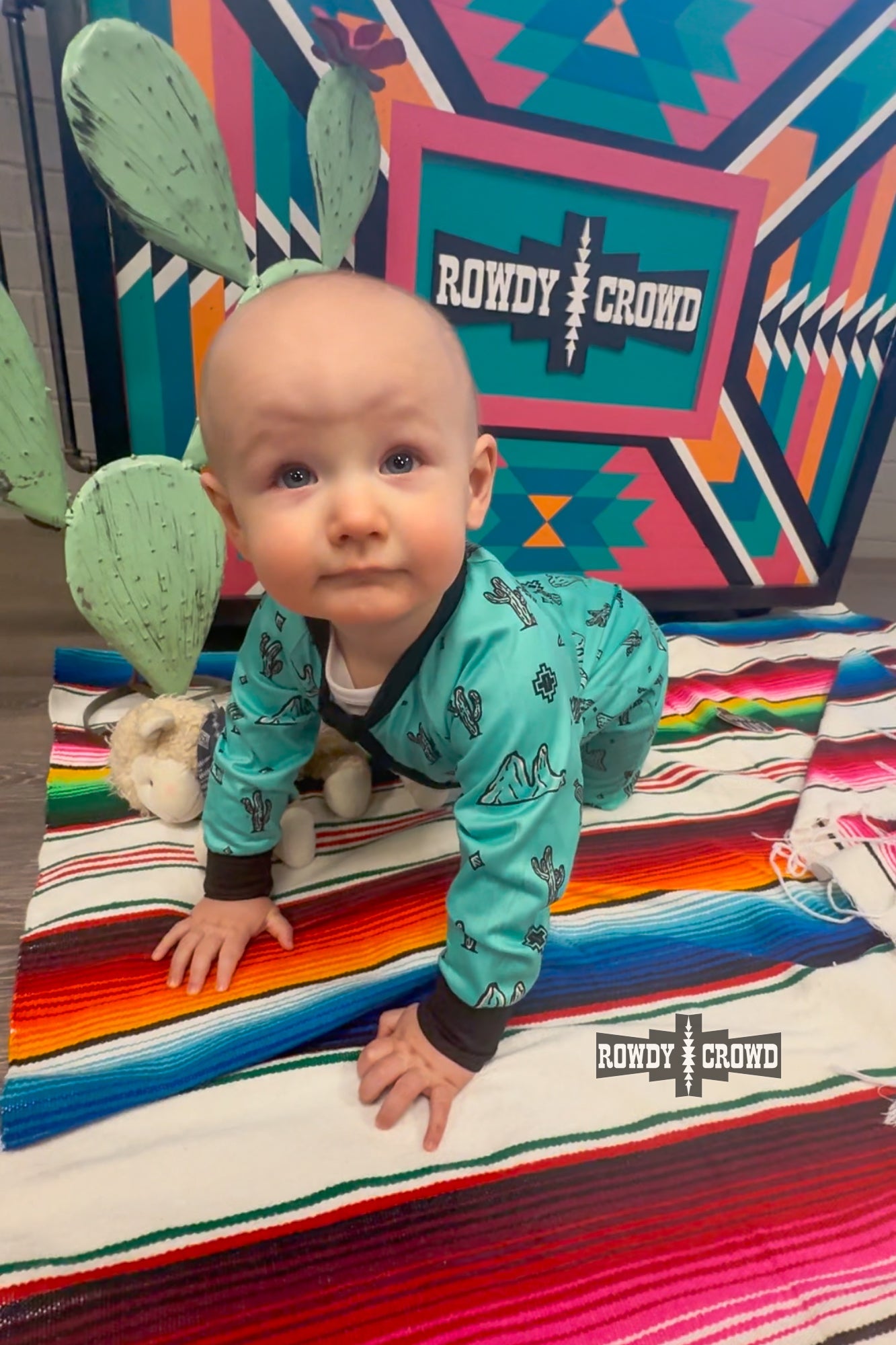 Welcome to Rowdy Kids! Cozy your kiddo up in the ultimate desert-inspired onesie. Our Howdy Desert Onesie is a long sleeved turquoise onesie with black desert shapes. This onesie will keep your little one comfy and cozy in all seasons.