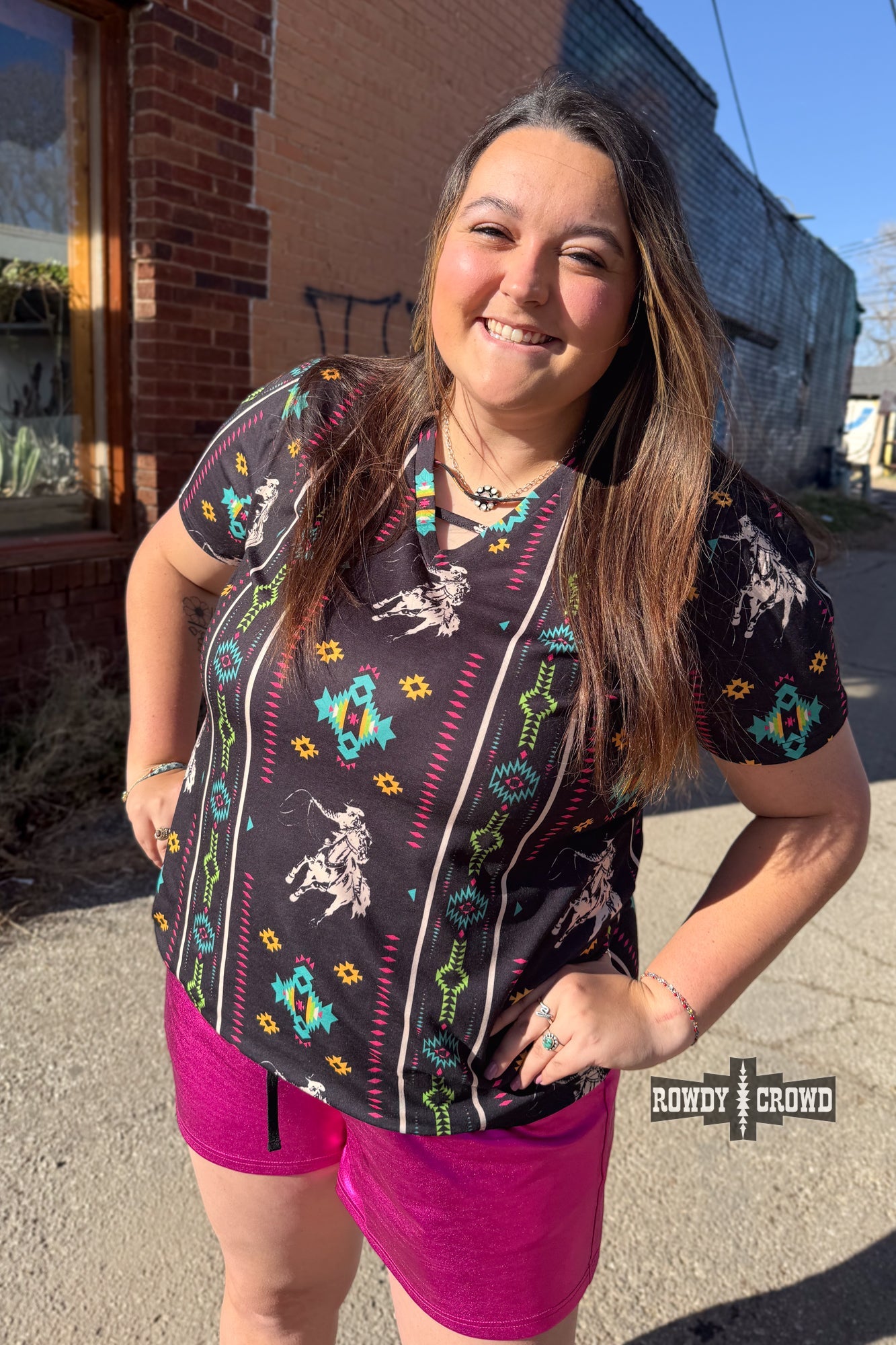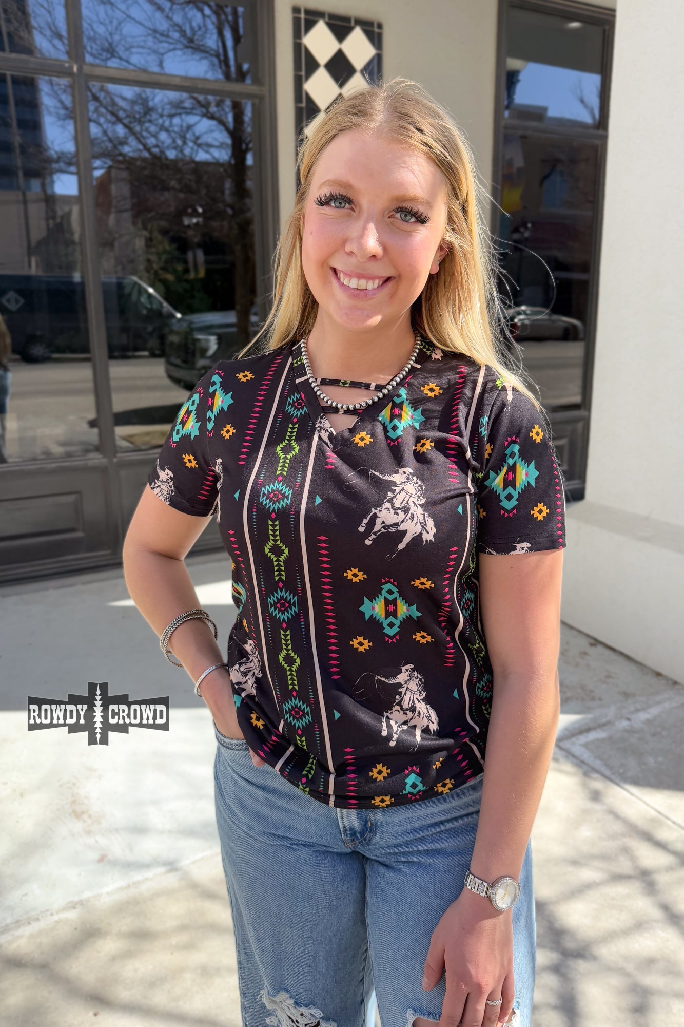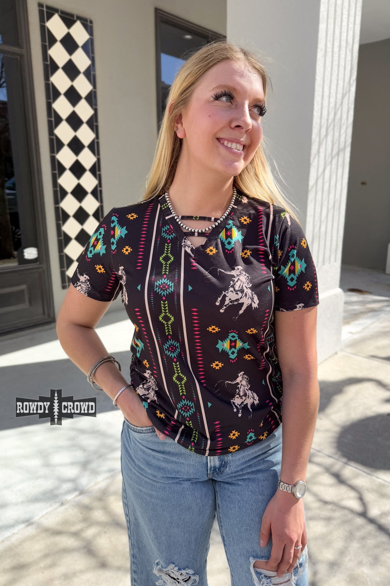 Let's RODEO in this fun and sleek top! Featuring a bold aztec print and a roper design, this top is sure to be your go-to. With criss-cross straps on the chest for added detail, this top is cute and ready to make a statement. Saddle up and get ready to turn heads!