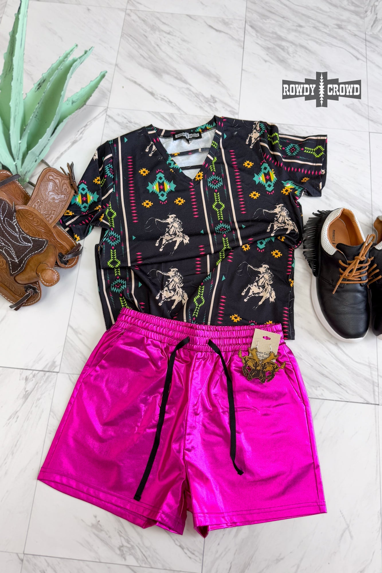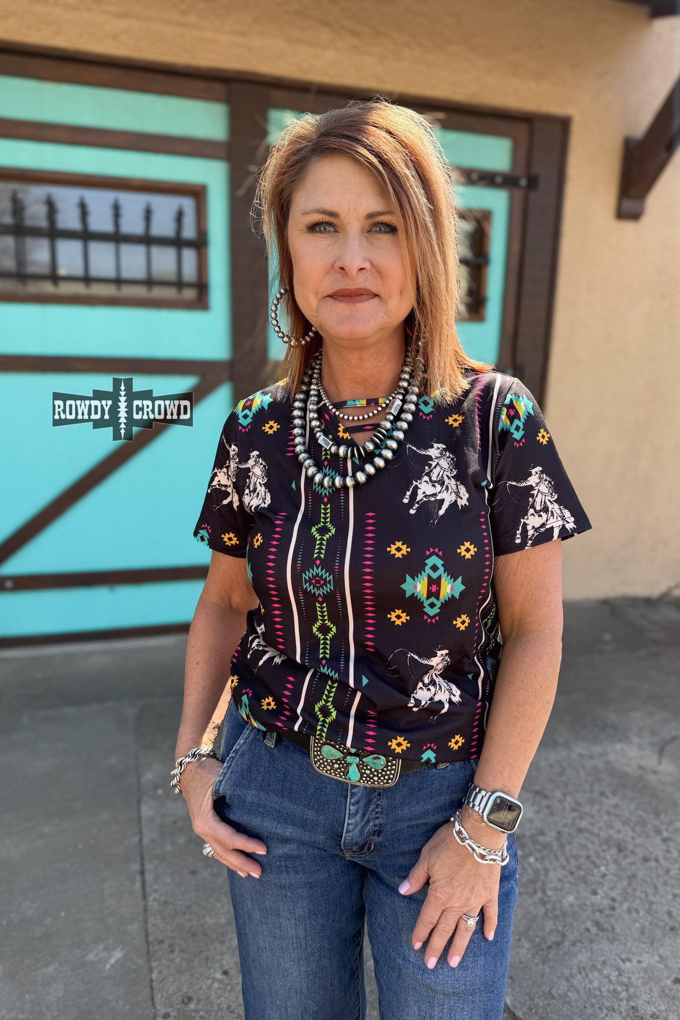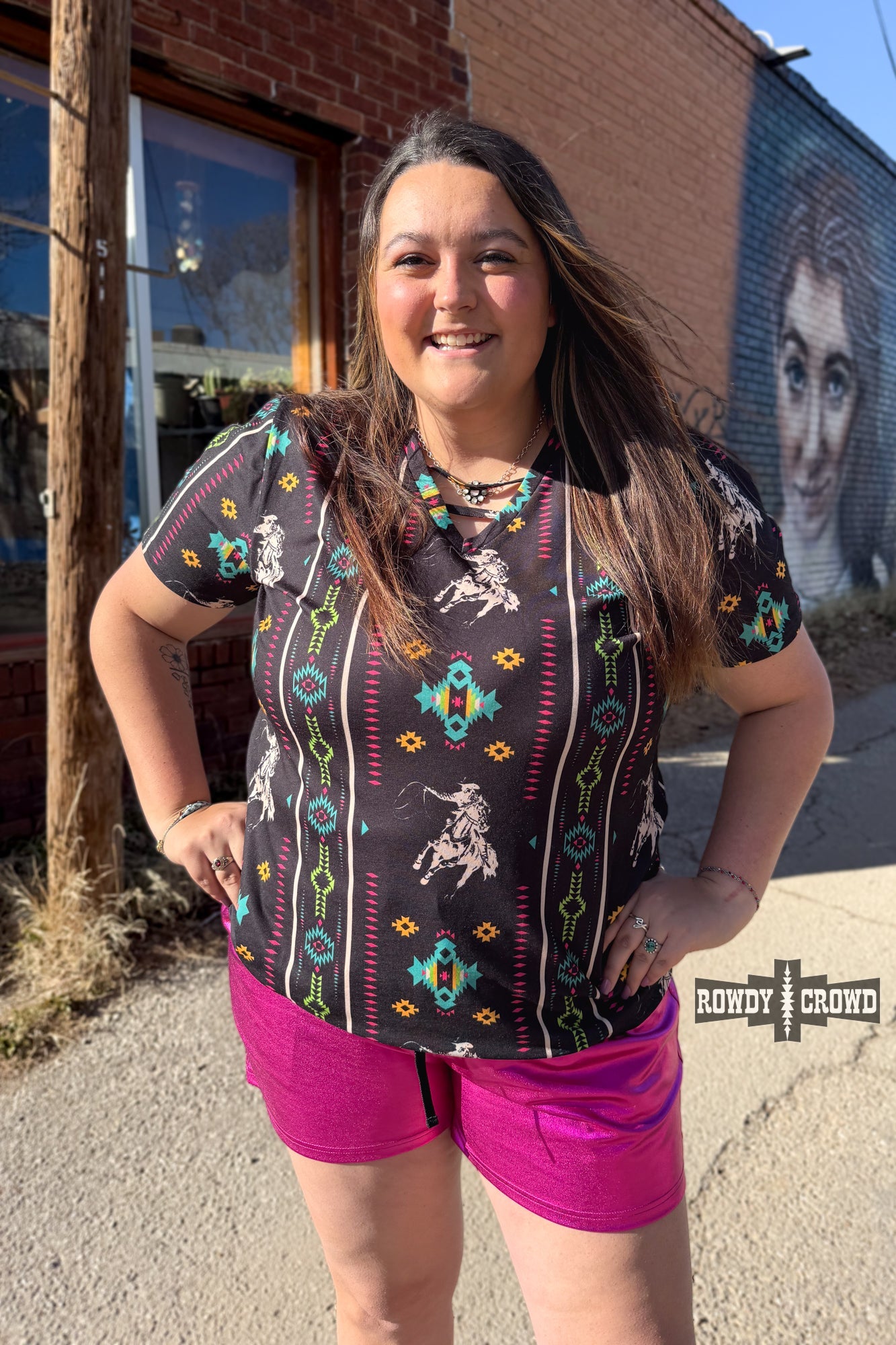 Let's RODEO in this fun and sleek top! Featuring a bold aztec print and a roper design, this top is sure to be your go-to. With criss-cross straps on the chest for added detail, this top is cute and ready to make a statement. Saddle up and get ready to turn heads!