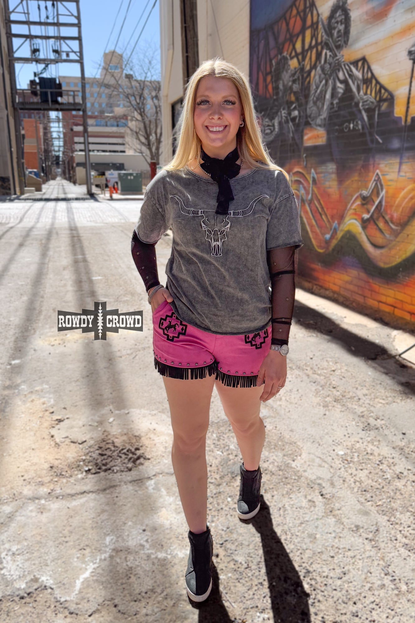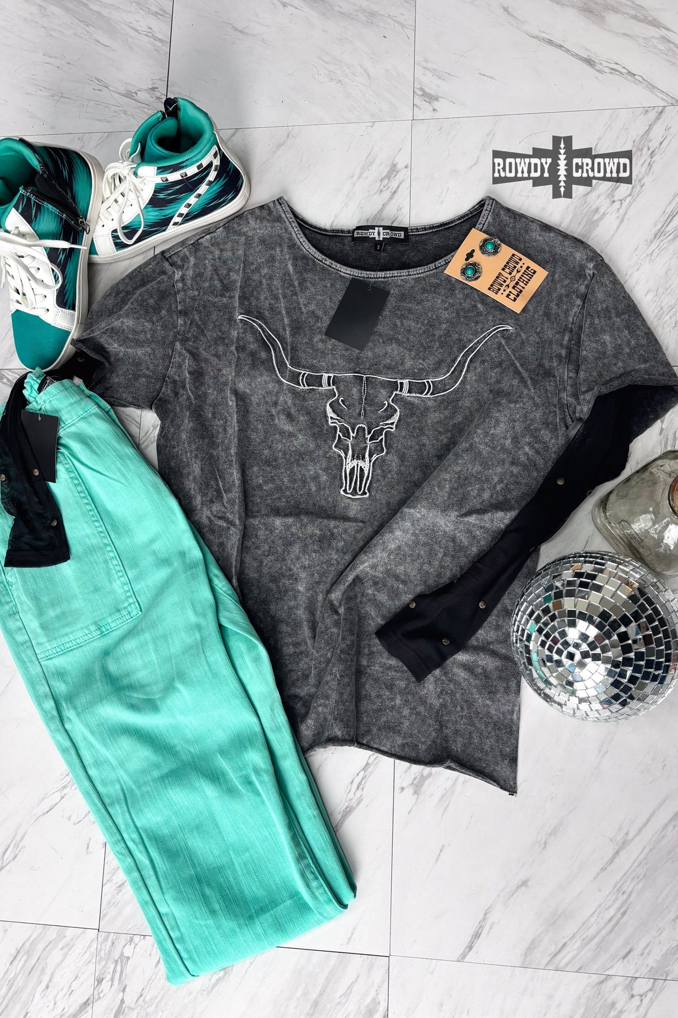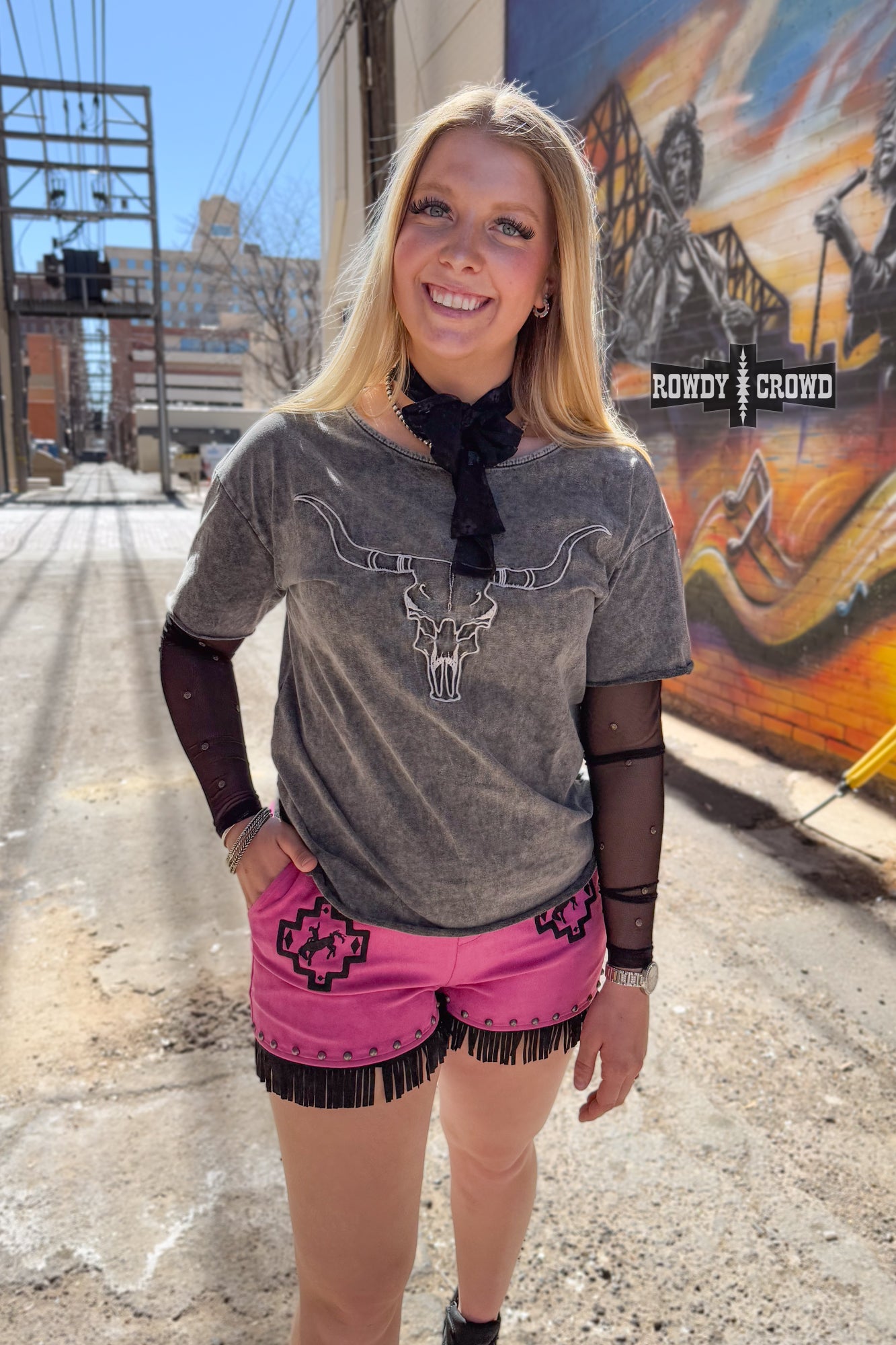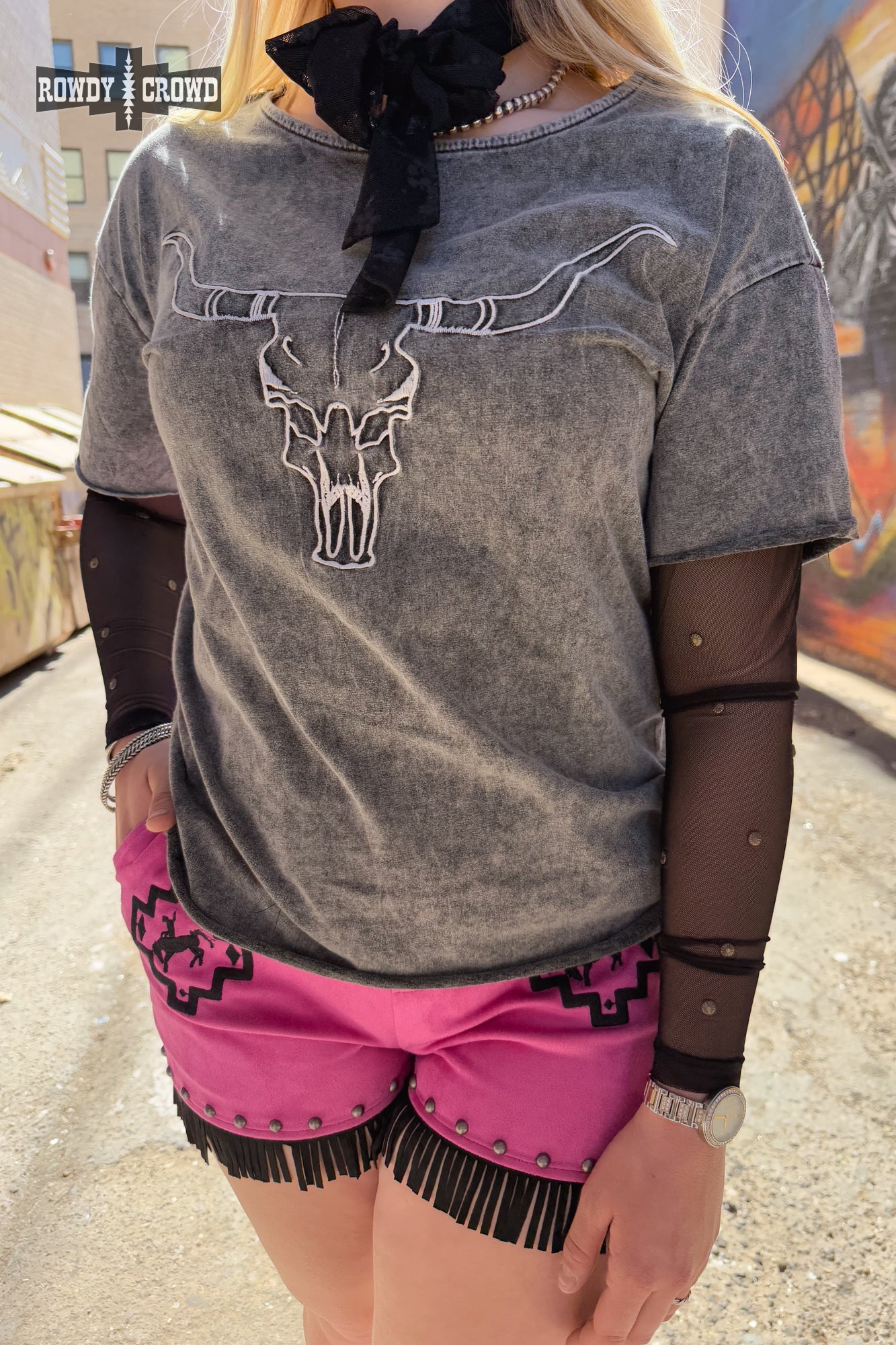 Presenting the Lone Star Steer Top, This shirt features long mesh sleeves with copper studs making it cool and edgy. This dark gray top features a longhorn print on the front. This top is perfect for casual days or country concert filled nights.