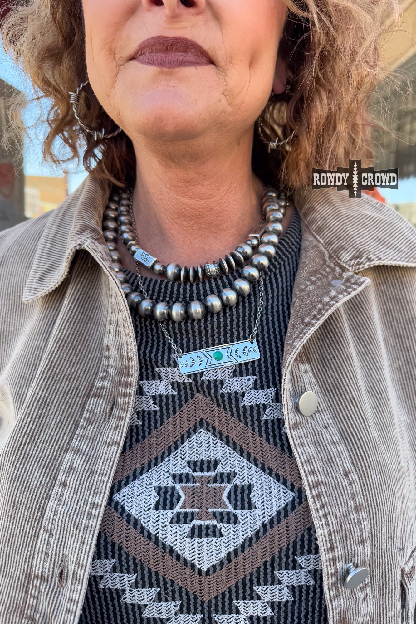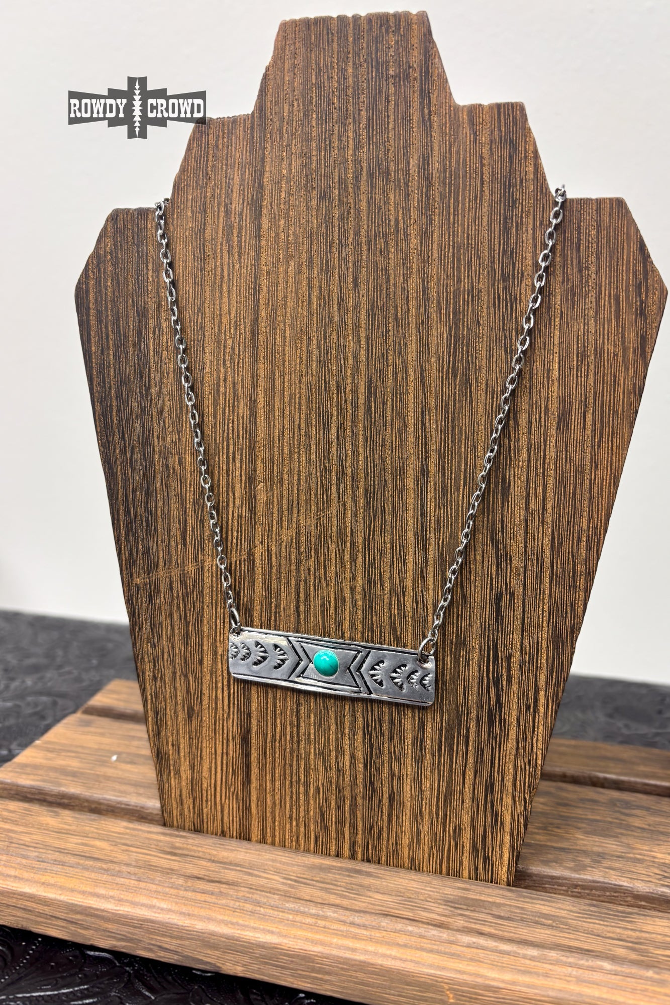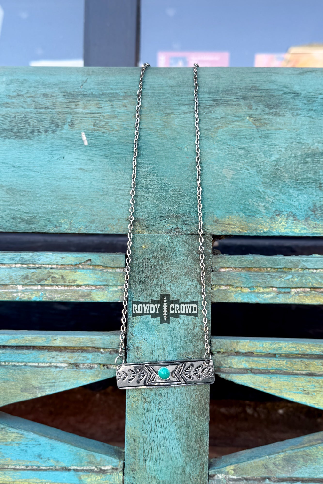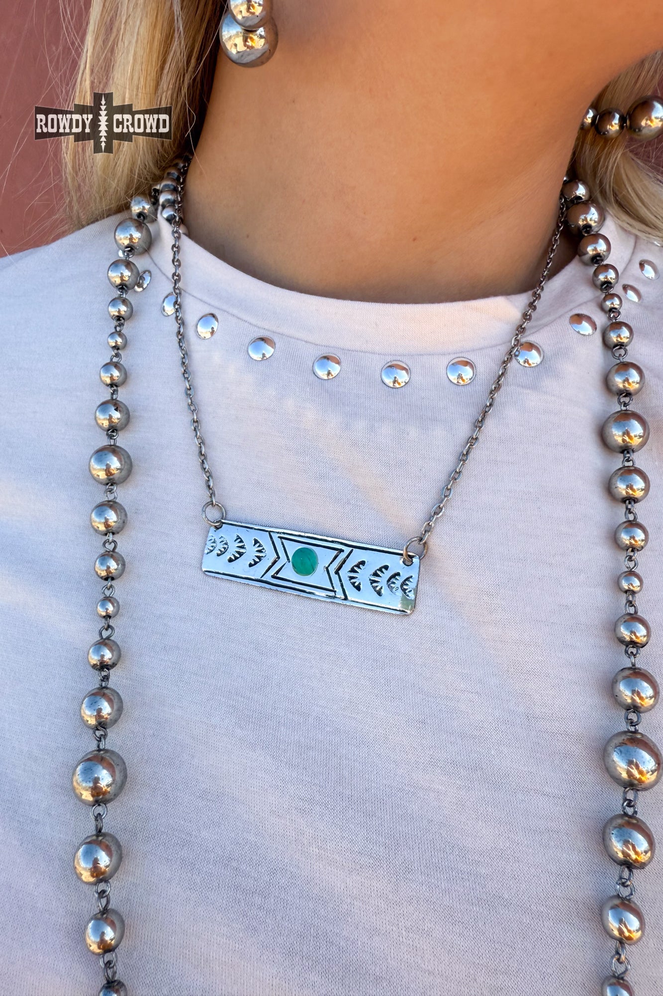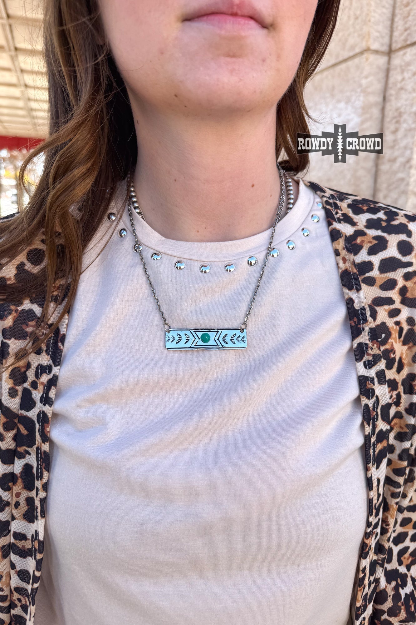 Need a new layering piece? The Midnight Rodeo necklace is perfect by itself or added to other necklaces allowing the best layered look. It's metal bar is accented with aztec engravings surrounding a beautiful turquoise stone. The Midnight Rodeo necklace is universal and lightweight with a lobster hook allowing for adjustment to the perfect length for you.
