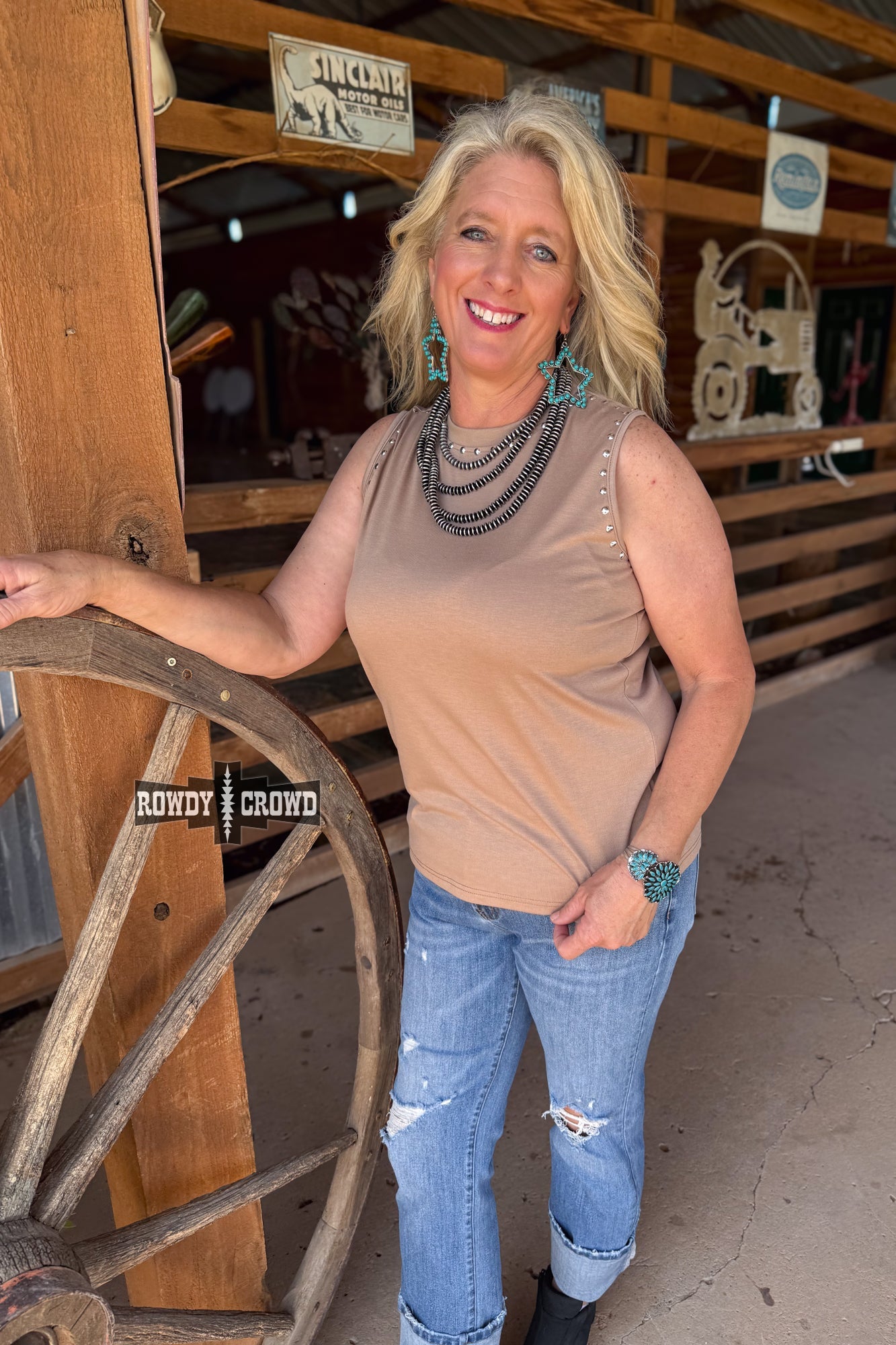 One of our favorites, now with no sleeves! Our Taupe Rowdy Studded tank is perfect for dressing up or down. It's silver studs along the neckline and shoulders add a touch of glamour, while still keeping you cool!