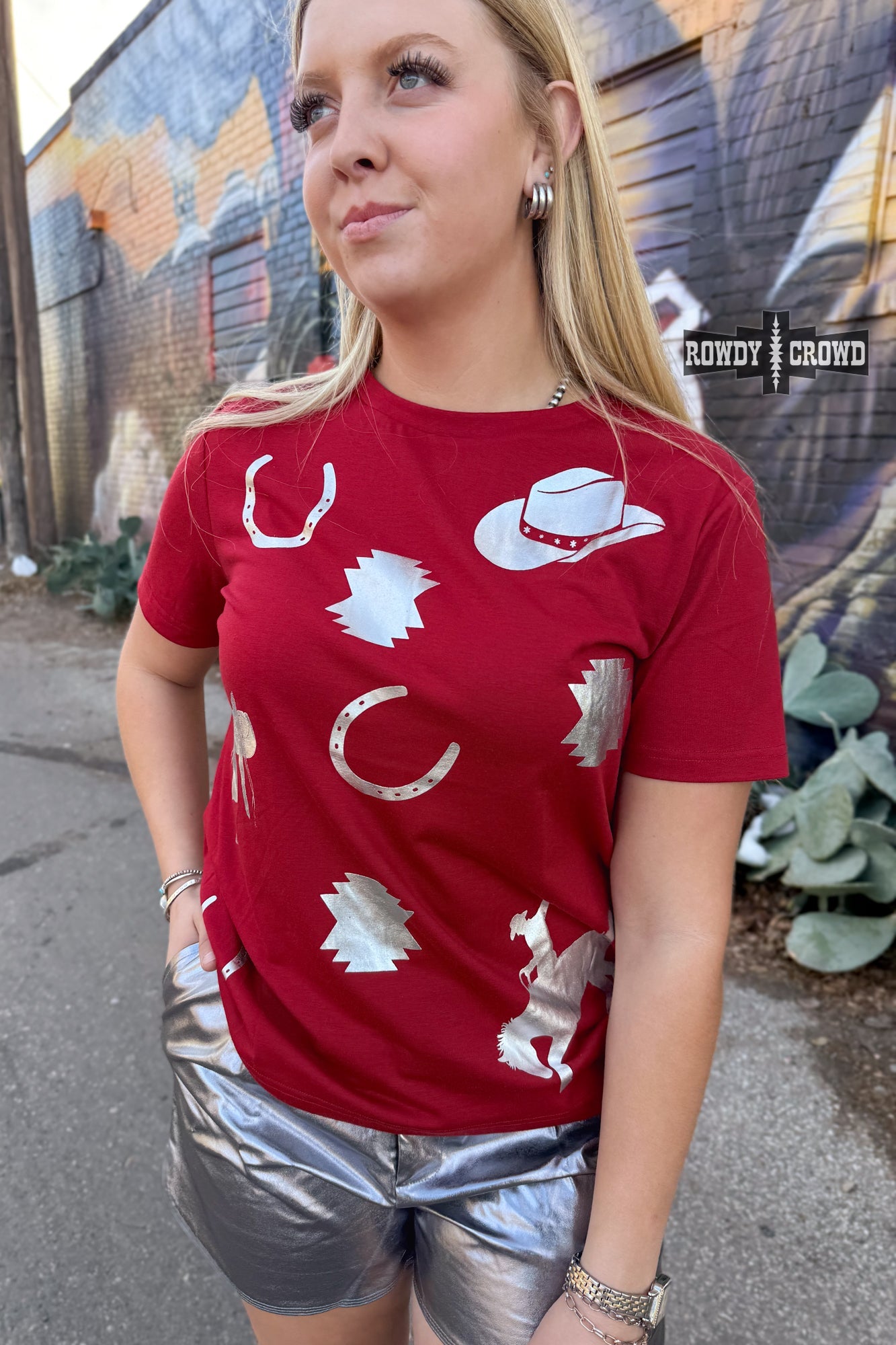 Get ready for the PERFECT summer concert tee. The Troubadour Tee is covered in metallic western prints on a solid cherry red tee. Its soft, lightweight and will easily keep you cool all summer long. Pair it with shorts, jeans and even leggings, its versatility leads to endless outfit possibilities.